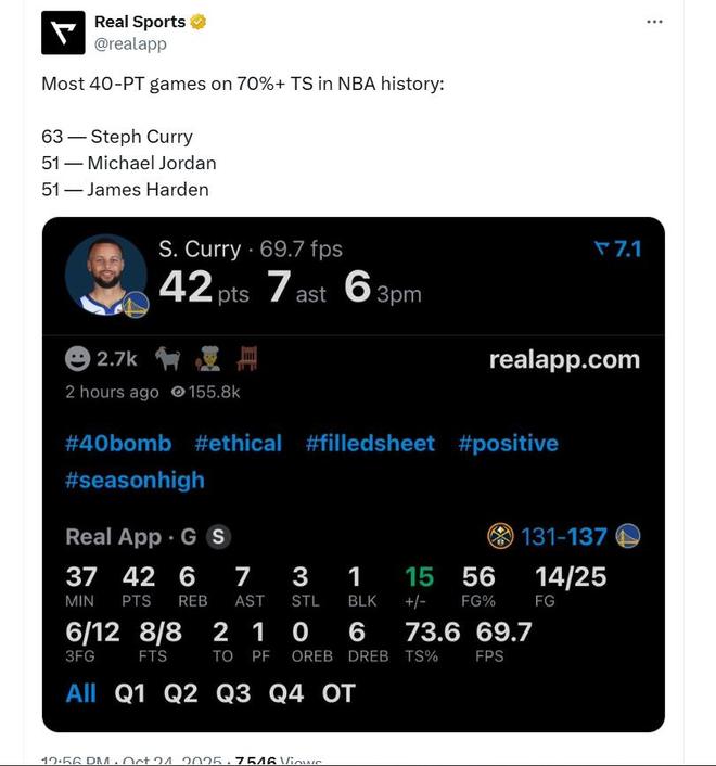 第3、据美媒Polymarket Hoops的数据统计,历史上30岁之后的40+场次,乔丹44场领跑,库里42场高居第2。