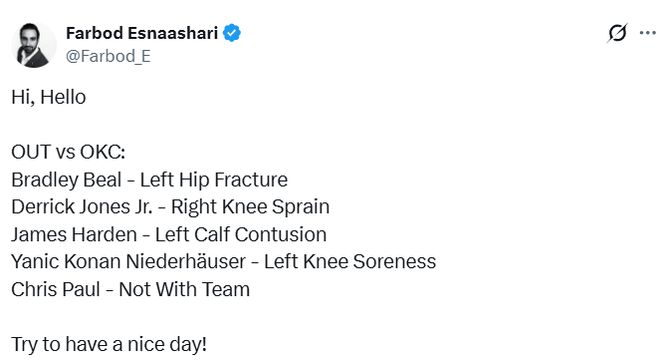 北京时间12月18日,快船官方更新明日对阵雷霆的伤病名单,哈登确定因左小腿挫伤缺阵。此外,比尔、小德里克-琼斯、尼德豪泽、保罗也都在缺阵名单上。队记报道,哈登没有随队前往俄克拉荷马城,后续对阵湖人的比赛状态暂不确定,他也有可能缺席洛城德比。