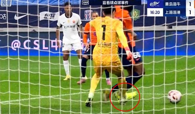原来在该轮青岛海牛主场迎战上港的比赛中,进行到十几分钟的时候出现一次疑似点球。蒋光太回传足球给门将颜骏凌,不料球速有点慢被突然杀出的青岛海牛前锋兰克尔-泽截胡。对手前锋率先触球,颜骏凌出脚想拦截为时已晚,疑似其后脚跟踩到对方的脚背(下图),随即兰克尔-泽倒地。