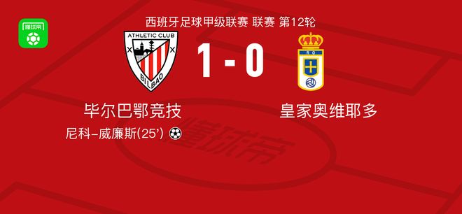 毕尔巴鄂竞技1-0皇家奥维耶多,尼科-威廉斯制胜