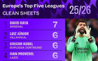 本赛季五大联赛门将零封榜:戴维-拉亚7次零封居首